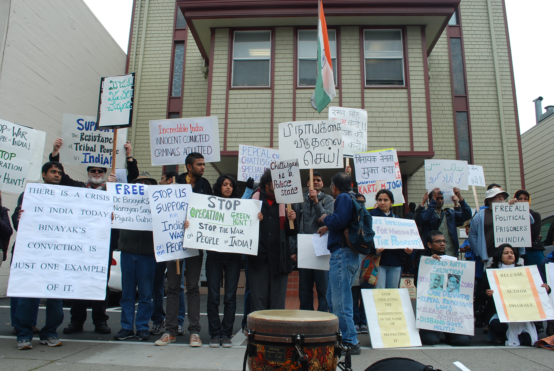 బినాయక్ సేన్ జైలు శిక్షకు వ్యతిరేకంగా శాన్ ఫ్రాన్సిస్కో (కాలిఫోర్నియా, అమెరికా) లోని ఇండియా రాయబార కార్యాలయం ముందు ఆందోళనకారుల ప్రదర్శన