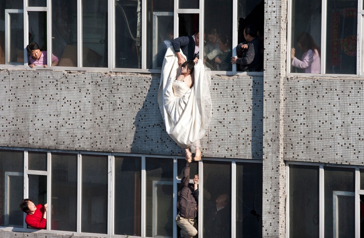 A man pulls a woman dressed in her wedding gown to safety after she attempted suicide when her husband-to-be refused to go ahead with their wedding plans in Changchun, northeast China’s Jilin province on May 17, 2011. China’s suicide rate has fallen over the years, thanks to a decline in rural women taking their own lives, attributed to mass migration to urban areas, which has pulled many rural women out of subordinate roles in their families. CHINA OUT AFP PHOTO (Photo credit should read STR/AFP/Getty Images)