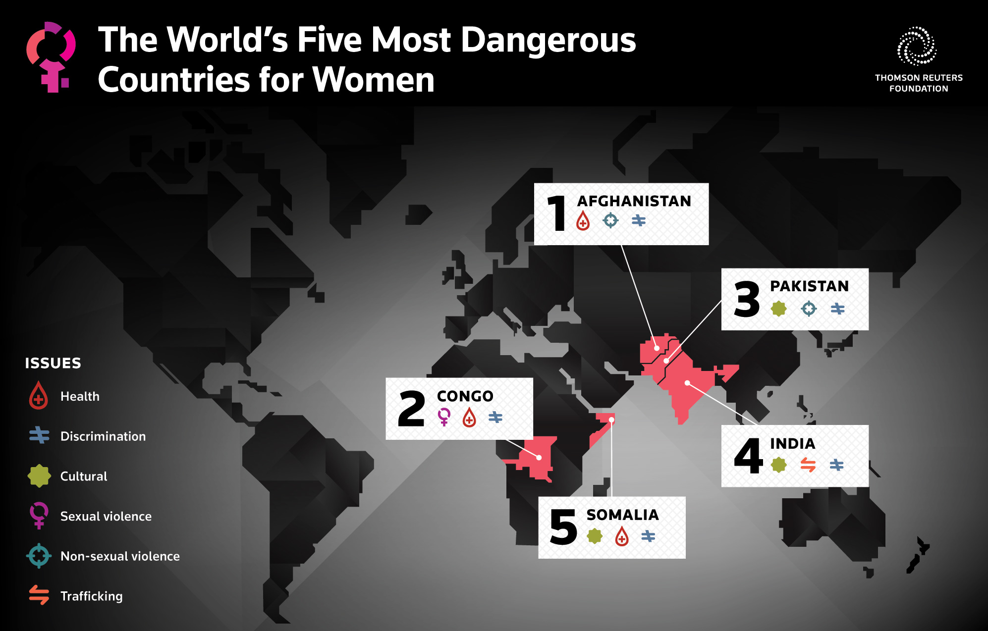 ప్రపంచంలో మహిళలకు అత్యంత ప్రమాదకరమైన దేశాలు ఏవి? రాయిటర్స్ వార్తా సంస్ధ అనుబంధంగా ఉండే ట్రస్ట్లా అనే సంస్ధ ఈ ప్రశ్నలకు సమాధానం కనుక్కోవడానికి సర్వే చేసింది. ఇది అవినీతి వ్యతిరేక అంశాలు (anti-corruption issues), సమర్ధ పాలన (good governance), మహిళల హక్కుల (women rights) అంశాలపై ప్రపంచ స్ధాయిలో ఉచితంగా వార్తలు, సమాచారం, న్యాయ సలహాలు అందించే సంస్ధ. ధామ్సన్ రాయిటర్స్ ఫౌండేషన్ దీన్ని నడుపుతోంది.