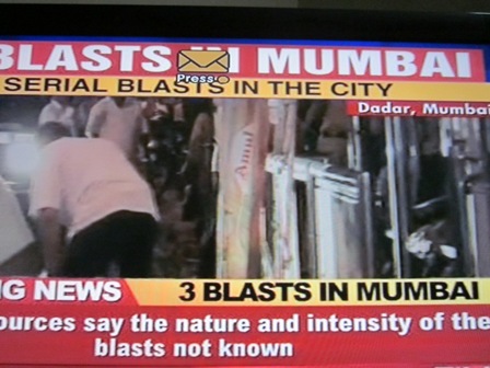 అప్ డేట్స్: ముంబైలో బుధవారం జరిగిన మూడు బాంబు పేలుళ్ళలో కనీసం 8 మంది చనిపోయారనీ 50 మందికి పైగా గాయపడ్డారని పోలీసులు చెబుతున్నారు. దాడులు టెర్రరిజానికి సంబంధించినదీ లేనిదీ ఇప్పుడే వ్యాఖ్యానించలేమని పోలీసు ప్రతినిధి చెప్పాడు. బాంబులు పేలిన మూడు ప్రాంతాలూ జన సమ్మర్ధంతో ఉన్నాయని తెలుస్తోంది. కనుక మృతుల సంఖ్య ఇంకా పెరిగా అవకాశం కనిపిస్తోంది. దక్షిణ ముంబైలోని ఒపేరా హౌస్ ప్రాంతం, జవేరీ బజార్ ప్రాంతాల్లోనూ, సెంట్రల్ ముంబైలోని దాదర్ ప్రాంతంలోని బాంబులు పేలినట్లు తెలుస్తోంది. టీవీ ఛానెళ్ళు లైవ్ ప్రసారం చేస్తున్నాయి.