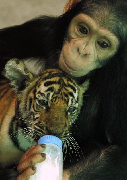 Published ఆగస్ట్ 01, 2011 at 443 × 630 in ‘పులి పాప’ను పాల డబ్బాతో సాకుతున్న ‘పిల్ల చింపాంజీ’ -ఫొటోలు