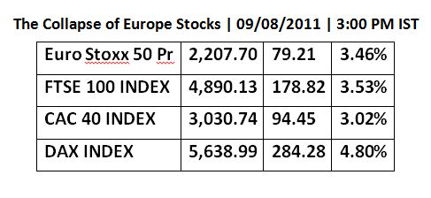 మంగళ వారం భారత కాలమానం ప్రకారం సాయంత్రం 3 గంటలకు యూరప్ లోని ప్రధాన దేశాలు బ్రిటన్ (ఎఫ్.టి.ఎస్.ఇ), ఫ్రాన్స్ (సి.ఎ.సి), జర్మనీ (డి.ఎ.ఎక్స్) ల షేర్ మార్కెట్ల పతనాన్ని పై టేబుల్ సూచిస్తుంది. సోమవారం దాదాపు 3 నుండి 5 శాతం వరకూ పతనమైన ఈ షేర్ల సూచిలు ఈరోజు కూడా 3 శాతం నుండి 5 శాతం వరకూ దారుణంగా నష్టపోయాయి. అంటే రెండు రోజుల్లోనె యూరోపియన్ మార్కెట్లు 6 శాతం నుండి 10 శాతం వరకూ నష్టపోవడం, తద్వారా కొన్ని వందల బిలియన్ల డాలర్ల మార్కెట్ కేపిటలైజేషన్ తుడిచిపెట్టుకుపోవడం నిజంగా మార్కెట్ ఎకానమీ గొప్పతనాన్ని సూచించేవా లేక ఆ వ్యవస్ధలోనె అంతర్గతంగా దాగిఉన్న వినాశకర వైరుధ్యాలను విప్పిచూపేవా అన్న విషయాన్ని కన్సర్వేటివ్ ఆర్ధిక విధానాల ప్రభోధకులు, నూతన ఆర్ధిక విధానాల ప్రచారకులు, నయా ఉదారవాద ఆర్ధిక విధానాల సమర్ధకులు ఇప్పటికైనా అంగీకరించవలసి ఉన్న అగత్యం వచ్చింది.