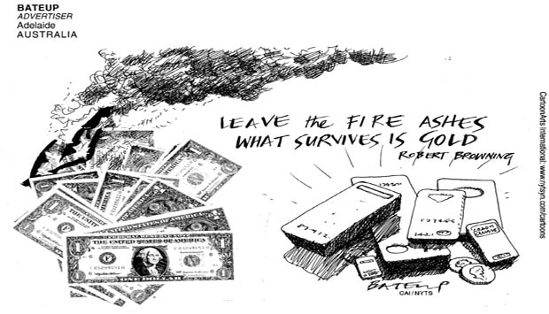 అమెరికా రుణ సంక్షోభం వలన డాలర్ విలువ కూడా పతనమవుతోంది. మదుపుదారులు సురక్షిత స్ధావరం కోసం ప్రయత్నిస్తూ బంగారం ని తెగ కొనేస్తున్నారు. దానితో డాలర్ ధర దిగజారుతుండగా, బంగారం ధర పైకి ఎగబాకుతోంది. అంటే కాగితం డబ్బు తరిగి పోతుండగా, బంగారాన్ని మళ్ళీ అంతర్జాతీయ ప్రామాణిక కరెన్సీగా చేయాలన్న వాదనలకు ప్రాణం వస్తోంది. “Leave the fire ashes, what remains is gold” అన్న ప్రఖ్యాత రచయిత, కవి రాబర్ట్ బ్రౌనింగ్ వాక్కులను నిజం చేస్తున్న ఈనాటి పరిస్ధితికి గీతల రూపం ఈ కార్టూన్.