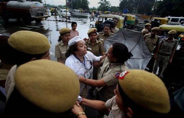 ఢిల్లీలోని రాజ్ ఘాట్ వద్ద పోలీసులతో ఘర్షణ పడుతున్న మద్దతుదారులు
