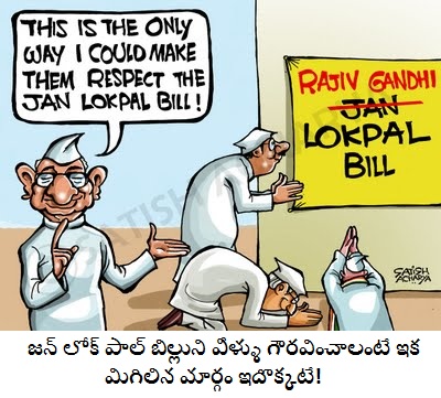 అవినీతి భరతం పట్టడానికి జన్ లోక్ పాల్ బిల్లుని తయారు చేసి ప్రభుత్వం ముందు పెట్టాడు, అన్నా హజారే. అది నచ్చని కాంగ్రెస్ మంత్రివర్యులు ఇచిన హామీల్ని డస్ట్బిన్ లోకి తోసి తమ లోక్పాల్ బిల్లునే లోక్ సభలో ప్రవేశపెట్టారు. ప్రధాని, అన్నాకి రాసిన లేఖలో పేర్కొన్నట్లు పౌర సమాజ సభ్యులు పదే పదే జన్ లోక్ పాల్ బిల్లుని పార్లమెంటులో పెట్టమని శతపోరినా మంత్రివర్యుల చెవికి ఆనడం లేదు. అందుకే అన్నా హజారే తరుణోపాయం ఆలోచించాలి. ఆయన కొంచెం తెలివిని ఉపయోగిస్తే…!