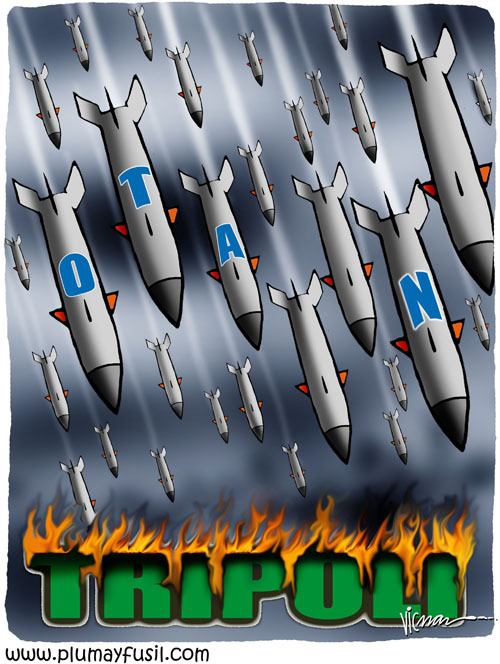 ఇప్పుడు ఫ్రాన్సు, బ్రిటన్, అమెరికాలు మొదట తలపెట్టిన కార్యక్రమం లిబియా ప్రజలకు ప్రజాస్వామిక వ్యవస్ధను అందించడమా? అలా భావిస్తే అమెరికా, బ్రిటన్, ఫ్రాన్సుల హంతక ముఠాను చిన్న చూపు చూసినట్లే. వారిప్పుడు లిబియా ఆయిల్ వనరుల పునః పంపిణీలో మునిగిపోయారు. తిరుగుబాటు సైన్యాలు ఇళ్ళపై పడి ఊచకోతలు సాగిస్తుంటే, హంతక ముఠా సౌదీ అరేబియా, ఖతార్ లాంటి అరబ్బు ప్రభువుల తో కలిసి ఆయిల్ విందుని భాగాలు పంచుకుంటున్నారు. లిబియాపై త్వరగా ఆధిపత్యం సాధించడానికి తద్వారా ఆయుధ ఖర్చు తగ్గించుకోవడం కోసం, స్వదేశంలోని వ్యతిరేకతను తగ్గించడం కోసమూ ట్రిపోలిపై హంతకముఠా సాగించిన అనైతిక వినాశనం ఈ కార్టూన్ లో: