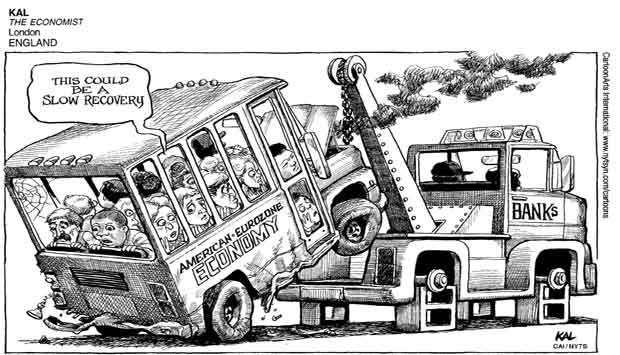 అసలే మందగమనంతో సాగుతున్న ఆమెరికా వ్యవస్ధ బడా బ్యాంకుల స్పీడ్ బ్రేకర్ల వలన సున్నకు దగ్గరగా ఆర్ధిక వృద్ధి నమోదు చేస్తుండగా దానినే “స్లో రికవరి” అని చెప్పుకుని సరిపెట్టుకుంటున్న పరిస్ధితిపై ఈ కార్టూన్: