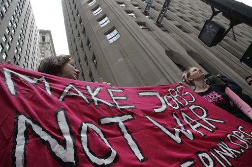 Demonstrators gather to call for the occupation of Wall Street, Saturday, Sept. 17, 2011, in New York. According to their website, the mission of the leaderless resistance movement is to flood thousands of people into lower Manhattan, set up beds, kitchens, peaceful barricades and occupy Wall Street for a few months in order to persuade President Barack Obama to establish a commission to end “the influence money has over representatives in Washington.” (AP Photo/Frank Franklin II)