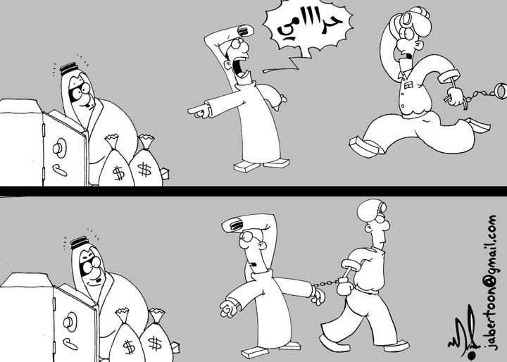 పెద్ద దొంగను పట్టిస్తే జైలుకి వెళ్ళేది పెద్ద దొంగ కాదు, అతనిని పట్టించాలనుకున్నవాడేనని సౌదీ అరేబియాకే చెందిన కార్టూనిస్టు అబ్దుల్లా జాబర్ గీసిన కార్టూన్ ఇది.