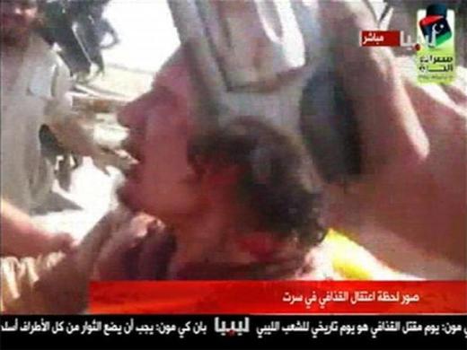 Former Libyan leader Muammar Gaddafi, covered in blood, is pulled from a truck by NTC fighters in Sirte in this still image taken from video footage October 20, 2011. Gaddafi was killed on Thursday as Libya’s new leaders declared they had overrun the last bastion of his long rule, sparking wild celebrations that eight months of war may finally be over. REUTERS/Libyan TV via Reuters TV (LIBYA – Tags: POLITICS CIVIL UNREST) THIS IMAGE HAS BEEN SUPPLIED BY A THIRD PARTY. IT IS DISTRIBUTED, EXACTLY AS RECEIVED BY REUTERS, AS A SERVICE TO CLIENTS