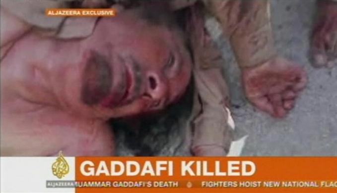 Former Libyan leader Muammar Gaddafi is seen in Sirte in this still image taken from video footage October 20, 2011. Gaddafi was killed on Thursday as Libya’s new leaders declared they had overrun the last bastion of his long rule, sparking wild celebrations that eight months of war may finally be over. REUTERS/Courtesy Al Jazeera TV (LIBYA – Tags: POLITICS CIVIL UNREST) FOR EDITORIAL USE ONLY. NOT FOR SALE FOR MARKETING OR ADVERTISING CAMPAIGNS. THIS IMAGE HAS BEEN SUPPLIED BY A THIRD PARTY. IT IS DISTRIBUTED, EXACTLY AS RECEIVED BY REUTERS, AS A SERVICE TO CLIENTS. MANDATORY CREDIT AL JAZEERA TV