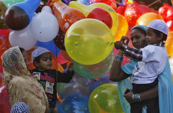 Children buy balloons after Eid al-Adha prayers outside a mosque in the northern Indian city of Chandigarh November 7, 2011. Muslims around the world celebrate Eid al-Adha by sacrificial slaughtering of sheep, goats, cows and camels to commemorate Prophet Abraham’s willingness to sacrifice his son Ismail on God’s command. REUTERS/Ajay Verma (INDIA – Tags: RELIGION SOCIETY)