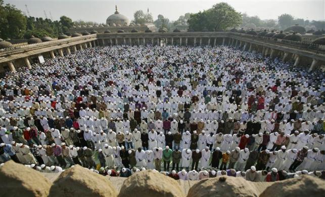 Muslims perform Eid al-Adha prayers at a mosque in the western Indian city of Ahmedabad November 7, 2011. Muslims around the world celebrate Eid al-Adha by sacrificial slaughtering of sheep, goats, cows and camels to commemorate Prophet Abraham’s willingness to sacrifice his son Ismail on God’s command. REUTERS/Amit Dave (INDIA – Tags: RELIGION SOCIETY)