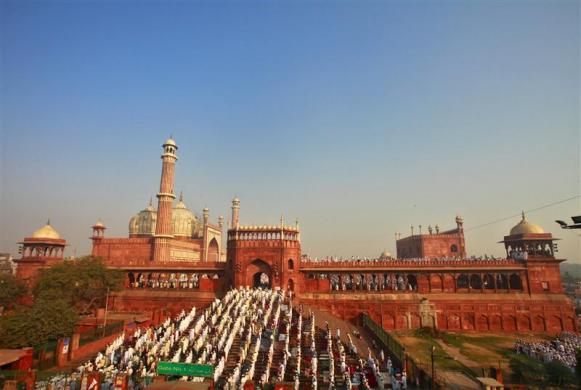 Muslims perform Eid al-Adha prayers at the Jama Masjid (Grand Mosque) in the old quarters of Delhi November 7, 2011. Muslims around the world celebrate Eid al-Adha by sacrificial slaughtering of sheep, goats, cows and camels to commemorate Prophet Abraham’s willingness to sacrifice his son Ismail on God’s command. REUTERS/B Mathur (INDIA – Tags: RELIGION SOCIETY)