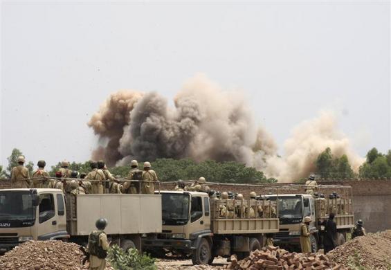 Paramilitary soldiers patrol during an operation near Bara, a town in the Khyber tribal region near the Afghan border June 29, 2008. Security forces have secured an area in Pakistan’s Khyber region, through which a main supply route passes into Afghanistan, a day after launching an offensive to push back militants threatening Peshawar.