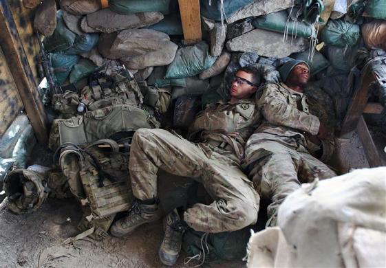 U.S. Army soldiers from Alpha Company 2nd battalion 27th infantry (the Wolfhounds), Task Force NO FEAR rest after their overnight duty at Observation Post Mace in eastern Afghanistan Kunar province near the border with Pakistan early August 29, 2011. REUTERS/Nikola Solic (AFGHANISTAN – Tags: MILITARY CONFLICT)