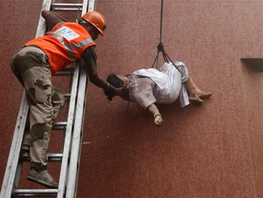 A fire fighter evacuates a patient from a hospital after it caught fire in Kolkata December 9, 2011. Fire swept through a hospital in the eastern Indian city of Kolkata on Friday, killing at least 40 people, most of them patients, officials said. REUTERS/Rupak De Chowdhuri (INDIA – Tags: DISASTER HEALTH)