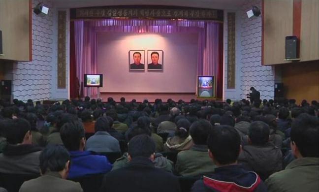 Employees of Pyongyang 326 Electric Wire Factory gather as they mourn over the death of North Korean leader Kim Jong-il, in a conference hall in Pyongyang December 19, 2011 in this still image taken from video. Kim Jong-il died on a train trip on Saturday, state television reported on Monday, sparking immediate concern over who is in control of the reclusive state and its nuclear programme. REUTERS/KCNA via Reuters TV (NORTH KOREA – Tags: POLITICS OBITUARY BUSINESS) NORTH KOREA OUT. NO COMMERCIAL OR EDITORIAL SALES IN NORTH KOREA. FOR EDITORIAL USE ONLY. NOT FOR SALE FOR MARKETING OR ADVERTISING CAMPAIGNS. THIS IMAGE HAS BEEN SUPPLIED BY A THIRD PARTY. IT IS DISTRIBUTED, EXACTLY AS RECEIVED BY REUTERS, AS A SERVICE TO CLIENTS