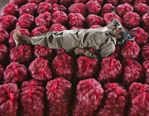 A man takes a nap on sacks filled with onions at a wholesale vegetable market on the outskirts of Jammu September 14, 2011. Indian inflation climbed to its highest in more than a year as prices of food and manufactured goods surged, reinforcing the case for another rate hike on Friday despite weakening growth and a worsening global outlook. REUTERS/Mukesh Gupta (INDIAN-ADMINISTERED KASHMIR – Tags: FOOD BUSINESS TPX IMAGES OF THE DAY)