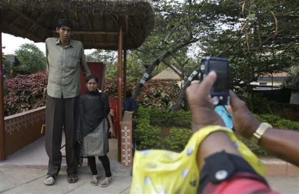 A visitor poses with Polipaka Gattaiah, who stands at seven-and-a-half feet and claims to be the tallest man in India, at the arts and crafts centre in the southern Indian city of Hyderabad December 6, 2011. Gattaiah entertains people who visit the centre. Visitors often give money to the 38-year-old man and pose for photographs with him. In March 2011, he was given a prosthetic foot by a charitable organisation after it was amputated a few years earlier because of an infection. It is said to be the longest prosthetic foot ever made, according to local media. Gattaiah is paid 6500 rupees ($130) a month by the state tourism department, officials said. Picture taken December 6, 2011. REUTERS/Krishnendu Halder (INDIA – Tags: SOCIETY)