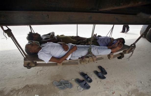 Men sleep in a hammock tied under a truck trailer parked on a road in Noida, located in the northern Indian state of Uttar Pradesh June 21, 2011. REUTERS/Parivartan Sharma (INDIA – Tags: SOCIETY)