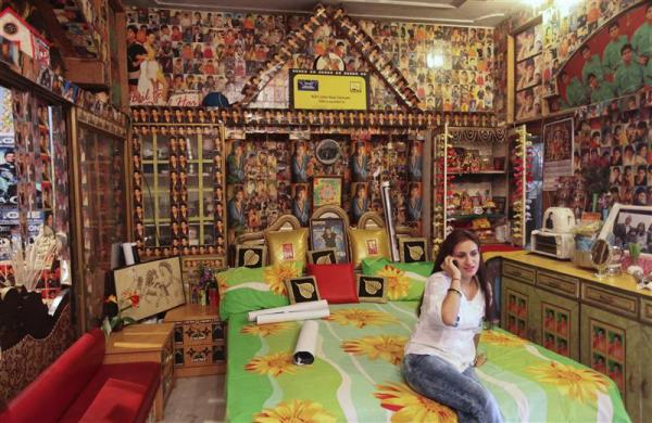 Ruchi Singh, wife of Vishal Singh, speaks on a phone in their bedroom in Lucknow October 25, 2011. Singh is a fan of the Bollywood actor Shah Rukh Khan and has more than 22,000 pictures of the star in his possession. Singh’s house, which he calls “Shahrukh palace,” and even his workplace, are covered with posters featuring the actor. Singh even changed his name to Vishahrukh Khan as a display of his love for the actor. Picture taken on October 25, 2011. REUTERS/Pawan Kumar (INDIA – Tags: SOCIETY)