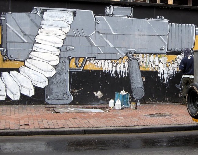 నిరుద్యోగ సైన్యం అమెరికా, యూరప్ ల యుద్ధోన్మాదానికి బలవుతున్న వాస్తవాన్ని ఈ వీధి చిత్రంలో వీధి చిత్రకారుడు ‘బ్లూ’ హృద్యంగా చిత్రీకరించాడు. సైన్యంలో చేరడానికి వచ్చిన యువకులు నిలబడ్డ క్యూలను బులెట్ల మ్యాగజైన్లుగానూ, ఆఫ్ఘనిస్ధాన్, ఇరాక్ లనుండి తిరిగివస్తున్న శవపేటికలు కాల్చాక మిగిలిన ఖాళీ బులెట్లుగానూ చిత్రించిన తీరు నిజంగా అద్భుతం.