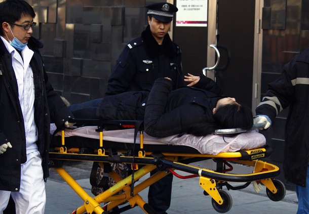 A woman, who was dragged away by the police after she refused to leave the Apple store, is taken to an ambulance on a stretcher in the Beijing district of Sanlitun January 13, 2012. Apple Inc said on Friday it will stop selling its latest iPhone in its retail stores in Beijing and Shanghai to ensure the safety of its customers and employees. The iPhone 4S, which went on sale early Friday, caused a near-riot in one of Apple’s Beijing retail stores. REUTERS/David Gray (CHINA – Tags: BUSINESS TELECOMS)