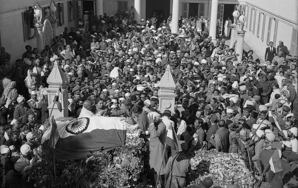 బిర్లా హౌస్ లో ‘మహాత్మగాంధీ’ పార్ధివ దేహం. పటేల్, నెహ్రూ, మౌంట్ బాటన్, బల్దేవ్ సింగ్, రామ్ దాస్ (గాంధీ పుత్రుడు) ఈ ఫొటోలో ఉన్నారు.