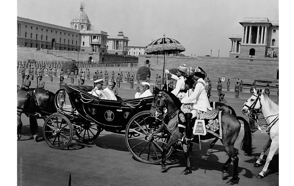 ప్రధమ రాష్ట్రపతిగా ఎన్నికయ్యాక సంప్రదాయం ప్రకారం ‘విజయ్ చౌక్’ గుండా డా. రాజేంద్ర ప్రసాద్ సవారీ చేసిన దృశ్యం.