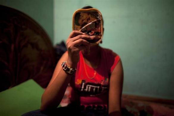 Twelve-year-old prostitute Mukti applies makeup before serving a customer inside her small room at a brothel in Faridpur, located in central Bangladesh February 22, 2012. Mukti is one of hundreds of mostly teenage sex workers living in a painful life of exploitation in slum brothels who take Oradexon , a steroid used by farmers to fatten their cattle, in order to gain weight and appear “healthier” and more attractive to clients. Picture taken February 22, 2012. REUTERS/Andrew Biraj (BANGLADESH – Tags: HEALTH SOCIETY BUSINESS EMPLOYMENT DRUGS)