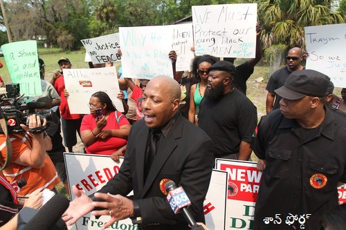 Mikhail Muhammad, center, Southern Regional Director of the New Black Panther Party, leads a protest outside the Sanford Police Department calling for the resignation of the police chief in response to the handling of the Trayvon Martin shooting in Sanford, Florida, Thursday, March 22, 2012. (Gary W. Green/Orlando Sentinel/MCT)