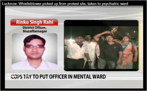 మాయావతి పాలన అవినీతి మయం అయిందంటూ ప్రచారం చేసి అధికారంలోకి వచ్చిన సమాజ్ వాదీ పార్టీ, రాష్ట్ర ప్రభుత్వ స్కీముల్లో జరుగుతున్న అవినీతి పై విచారణ కోరుతూ ధర్నా చేస్తున్న రాష్ట్ర అధికారిని పిచ్చాసుపత్రిలో చేర్చడానికి ప్రయత్నించింది. అధికారిని చేర్చుకోవడానికి డాక్టర్లు నిరాకరించడంతో పోలీసులు వెనుదిరగవలసి వచ్చింది. రెండేళ్ల క్రితం మాఫియా కాల్పుల్లో కన్ను కోల్పోయినప్పటికీ అవినీతి వ్యతిరేక పోరాటం కొనసాగిస్తున్నందుకు ‘రింకు సింగ్ రాహి’ని పిచ్చివాడుగా ఉత్తర ప్రదేశ్ రాష్ట్ర ప్రభుత్వం భావిస్తోంది.