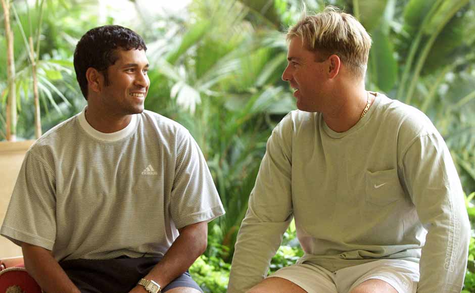 2001; Sachin and Shane Warne catch up at the Taj Mahal Hotel, Mumbai. Maybe his first try at flattening his hair -Getty Images