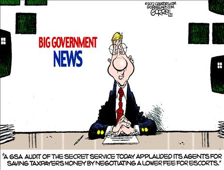 కొలంబియాలో ఒబామా భద్రత కోసం వెళ్ళిన భద్రతా సిబ్బంది పన్నెండు మంది ‘ఎస్కార్ట్’ మహిళలతో ఉండగా దొరికిపోయి విచారణ ఎదుర్కొంటున్న సంగతి తెలిసిందే. ‘ఆర్గనైజేషన్ ఆఫ్ అమెరికా స్టేట్స్’ కాన్ఫరెన్స్ కోసం కొలంబియా లోని కార్టిజీనా నగరానికి కొద్ది రోజుల క్రితం ఒబామా వెళ్ళివచ్చాడు. స్ధానిక క్లబ్ లో తాగి అక్కడే మహిళలతో బేరం కుదుర్చుకుని తాము బస చేసిన హోటల్ కి తీసుకెళ్లారు. $800 ఇస్తానని చెప్పి ఉదయాన్నే $30 మాత్రమే ఇవ్వజూపడంతో ఒక మహిళ పోలీసులకి ఫిర్యాదు చేసింది. ఒబామా భద్రత కోసం వచ్చిన సీక్రెట్ సర్వీస్ ఏజెంట్స్ అని తెలియని మహిళలు వారి మోసాన్ని పోలీసుల ద్వారా ఎదుర్కోవాలని ప్రయత్నించారు. ఒకరు అసలు డబ్బులు ఇవ్వను పొమ్మనగా మరొకరు $47 డాలర్లు ఇచ్చి సరిపెట్టాడు. అమెరికా సీక్రెస్ సర్వీస్ ఏజెంట్ల పొదుపు లక్షణం గురించి వేసిన ఈ కార్టూన్ ని టౌన్ హాల్ డాట్ కామ్ వెబ్ సైట్ ప్రచురించింది.