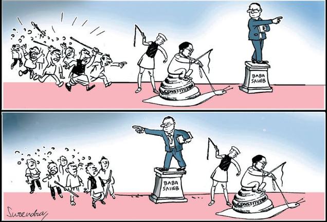 శుక్రవారం పార్లమెంటులో అంబేడ్కర్ కార్టూన్ విషయంలో జరిగిన రగడ కు స్పందనగా ‘ది హిందూ’ పత్రిక కార్టూనిస్టు ‘సురేంద్ర’ గీసిన కార్టూన్ ఇది. మమత బెనర్జీ పై గీసిన కార్టూన్ ని ఈమెయిల్ ద్వారా ఇతరులకు పంపాడన్న కారణంతో ఒక యూనివర్సిటీ ప్రొఫెసర్ పైన కేసులు పెట్టి వేధించడాన్ని దేశం మొత్తం ఖండించింది. దేశ రాజకీయ నాయకులతో పాటు, అనేక మంది స్కాలర్లు, విద్యావేత్తలు, రాజకీయ వేత్తలు మెచ్చిన కార్టూనిస్టు ‘శంకర్’ గీసిన కార్టూన్ అరవై అయిదేళ్ల తర్వాత వివాదానికి కారణం కావడం విచారకరం. బహుశా అంబేడ్కర్ బతికే ఉన్నా తనపై గీసిన కార్టూన్ కి ఇంత రగడ జరగడానికి అనుమతించేవాడు కాదేమో. ప్రజాస్వామ్య వ్యవస్ధలో విమర్శలకు ఏదీ అతీతం కాదన్న తెలివిడి పెరిగిందా తరిగిందా అన్న అనుమానం వస్తే దానికి బాధ్యులు ఎవరు?