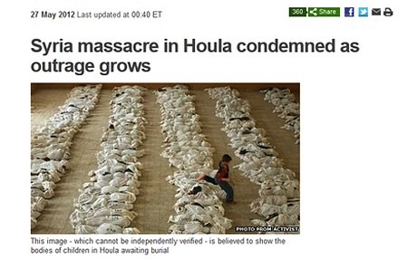 సిరియా ‘కిరాయి తిరుగుబాటు’ కు సంబంధించి పశ్చిమ దేశాల కార్పొరేట్ వార్తా సంస్ధలు సిరియా ప్రభుత్వంపై దుష్ప్రచారం చేస్తున్న సంగతి మరోసారి లోకానికి వెల్లడయింది. 2003 సంవత్సరంలో ఇరాక్ యుద్ధంలో తీసిన ఫోటోను ఆదివారం సిరియాలో జరిగిన హత్యాకాండగా చెప్పడానికి బి.బి.సి చేసిన ప్రయత్నం ‘ది టెలిగ్రాఫ్’ వెల్లడి చేసింది. అమెరికా, ఫ్రాన్స్, జర్మనీ, బ్రిటన్ లాంటి దేశాల ఆయుధ, ఫైనాన్స్ సాయంతో, సౌదీ అరేబియా, ఖతార్ లాంటి మత ఛాందస ప్రభుత్వాల ప్రత్యక్ష మద్దతుతో సిరియా ప్రజలు ఎదుర్కొంటున్న కిరాయి తిరుగుబాటుకు పశ్చిమ పత్రికలు ఇస్తున్న దుర్మార్గ ప్రచారం ప్రపంచానికి మరోసారి తెలిసి వచ్చింది.