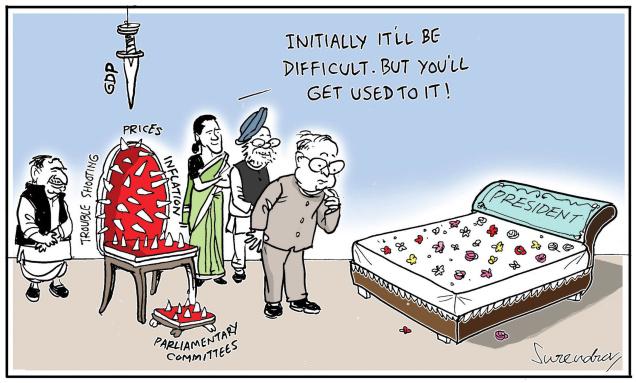 ద్రవ్యోల్బణం, అధిక ధరలు, జిడిపి వృద్ధి క్షీణత, కాంగ్రెస్ అంతర్గత సమస్యల పరిష్కారం, అనేక పార్లమెంటరీ కమిటీల సారధ్యం లాంటి ముళ్లు దండిగా ఉన్న కుర్చీకి అలవాటు పడిన ప్రణబ్ ముఖర్జీ ఒక్కసారిగా పూల పాన్పుపై పవళించవలసి రావడం కష్టమేనని ‘ది హిందూ’ కార్టూనిస్టు సురేంద్ర ఈ విధంగా కార్టూనికరించాడు.