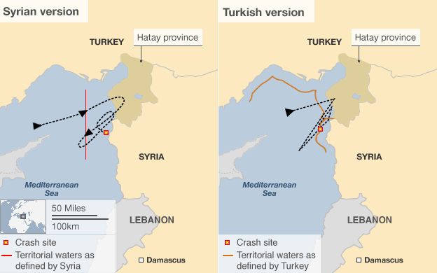 తమ విమాన శిధిలాలు సిరియా జలాల్లోనే కూలాయని టర్కీ అంగీకరించింది. అయినప్పటికీ విమానం మాత్రం అంతర్జాతీయ ‘ఎయిర్ స్పేస్’ లోనే ఉన్నట్లు టర్కీ బొంకుతోంది. అమెరికా గూఢచార అధికారి ఒకరు ఇచ్చిన సమాచారం కూడా టర్కీ చెబుతున్నదానికి విరుద్ధంగా ఉంది. అమెరికా అధికారి ‘వాల్ స్ట్రీట్ జర్నల్’ పత్రికకు చెప్పినదాని ప్రకారం సిరియన్లు టర్కీ యుద్ధ విమానాన్ని ఒడ్డుపై ఆధారపడి ఉన్న విమాన వ్యతిరేక ఫిరంగులతోనే (Anti-aircraft artillery) కూల్చారు తప్ప ‘ఉపరితలం నుండి గాలిలోకి ప్రయోగించే’ (surface-to-air) మిస్సైళ్లతో కాదు. దానర్ధం టర్కీ విమానం సిరియా గగనతలంలో ఎగురుతున్నట్లేనని ‘ది హిందూ’ తెలిపింది.