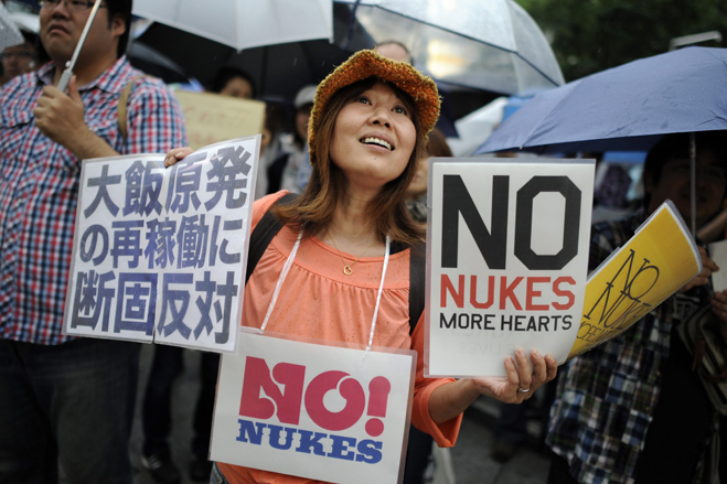 epa03290774 A woman holds placards and shouts slogans during an anti nuclear rally in Tokyo, Japan, 01 July 2012. Thousands of protesters participated in the rally on the same day that the Kansai Electric Power Company restarted the No. 3 reactor at the Oi nuclear power plant at the Sea of Japan coast in western Japan. It is the first time a nuclear reactor is resuming operations after Japan had no active nuclear reactors for almost two months. EPA/FRANCK ROBICHON