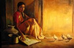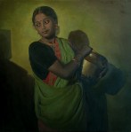 పొగ గొట్టం ఊది నిప్పు రాజేసినా, బియ్యం నుండి రాళ్లు మట్టిగడ్డలను ఏరివేసే ప్రాసెసింగ్ శ్రమ అయినా, ఇంటి నిట్రాడుకి తాడేసి కవ్వం చిలికి వెన్న మజ్జిగలు తీసినా, ఆన్నం, కూర, మజ్జిగ సిద్ధపరిచి పొలమెళ్ళిన మగని కోసం వాకిట అభిసారికగా మారినా, కొడవలిని చలాగ్గా దిగేసి పైరు పొలంలో కలుపు ఏరేసినా, చీర కుప్పలో ఒద్దికగా ఒదిగి పూల మాలలల్లినా, చంటి పిల్లాడిని ఎత్తుకుని చందమామకు కబురంపినా, చివరికి తోచడానికి లేక మునివేళ్లతో చుబుకాన్ని ఎత్తిపట్టి గోడవారగా పక్కింటి ఇల్లాలితో చెతురు ముచ్చట్లాడినా అది భారత స్త్రీ అందాన్ని ద్విగుణీకృతం చేసే శ్రమ సౌందర్యమే. ఆ శ్రమ సౌందర్యానికి మెరుపులు అద్దేదీ చీర, ఓణీ, పరికిణీలే. చీర, ఓణి పరికిణీలు భారత స్త్రీ ఆస్తి. పంచుకునే కొద్దీ పెరుగుతూ పోయే సంపద. ఇళయరాజా గీసిన ఈ పెయింటింగ్ లు ఆ విషయాన్ని ఎంతో చక్కగా చెపుతున్నాయి. ఫొటోలకి ఏ మాత్రం తగ్గని ఈ చేతి చిత్రణ గురించి చెప్పడానికి మాటలు సరిపోవు. ప్రతి అంగుళం పైనా శ్రద్ధపెట్టి గోడలు, కుండలు, పొయ్యిలు, చెక్కలు, అరుగులు కూడా మాట్లాడుతున్నట్లున్న పెయింటింగ్ ల గురించి ఇంకా చాలా చాలా చెప్పుకోవచ్చనిపిస్తుంది.