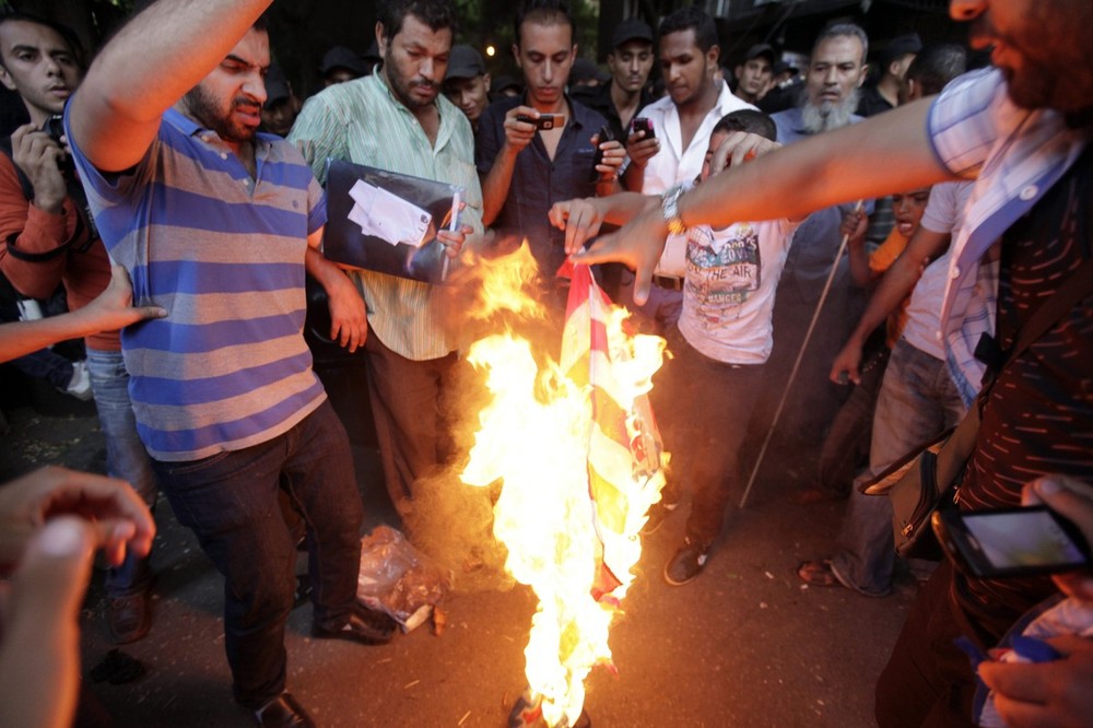 Egyptian protesters burn the U.S. flag during a demonstration outside the U.S. embassy in Cairo, as demonstrators gathered to condemn what they said was a film being produced in the United States that insulted Prophet Mohammad, September 12, 2012. REUTERS/Mohamed Abd El Ghany (EGYPT – Tags: CIVIL UNREST POLITICS RELIGION)