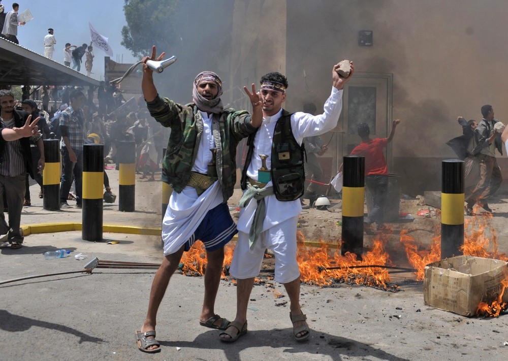 epa03396302 Yemeni protesters storm the US embassy during a protest against a film deemed insulting to the Prophet Mohammed, Sana’a, Yemen, 13 September 2012. Angry protesters storming the US embassy in the Yemeni capital Sana’a were fired at by security forces, according to local media reports. EPA/YAHYA ARHAB