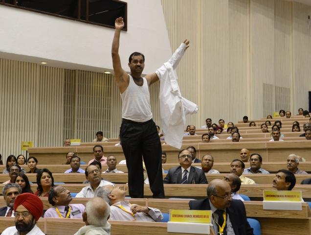 నినాదాలు విన్న నలుగురైదుగురు భద్రతాధికారులు అప్రమత్తం అయ్యారు. విజ్ఞాన్ భవన్ లోని ప్లీనరీ హాల్ లో నిరసన తెలుపుతున్న సంతోష్ కుమార్ వద్దకు పరుగు పరుగున చేరుకున్నారు. కిందికి లాగి నోరు మూసి బైటికి తీసుకెళ్ళారు. సంతోష్ కుమార్ నినాదాలు ఇస్తున్న దృశ్యాన్ని టి.వి చానెళ్ళు కూడా ప్రసారం చేశాయి. సంతోష్ ని బైటికి తీసుకెళ్ళేవారకూ ప్రధాని తన ప్రసంగం మొదలు పెట్టకుండా వేచి చూశాడు.