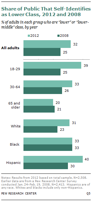 అల్పాదాయాలతో సరిపెట్టుకుంటున్నవారి సంఖ్య యువకుల్లో బాగా ఎక్కువగా ఉందని అధ్యయనంలో స్పష్టం అయింది. 18-29 మధ్య వయస్కులైన యువకుల్లో తమను తాము అల్పాదాయ వర్గంగా భావించుకునేవారు 2008లో 25 శాతం ఉండగా 2012 లో 40 శాతానికి చేరింది. మద్య వయసు నుండి రిటైర్ మెంట్ వయసు వరకూ (30-64 సం.) ఉన్నవారిలో అల్పాదాయ వర్గాలు 2008లో 26 శాతం ఉంటే 2012 లో 33 శాతానికి చేరుకుంది. జాతుల పరంగా చూస్తే తెల్లవారు, హిస్పానిక్కుల్లో అల్పాదాయ వర్గాల సంఖ్య బాగా పెరిగింది. తెల్లవారిలో ఈ పెరుగుదల 8 శాతం (23% నుండి 31% కు) ఉండగా హిస్పానిక్కుల్లో 10 శాతం (30% నుండి 40% కి) పెరుగుదల సంభవించింది.