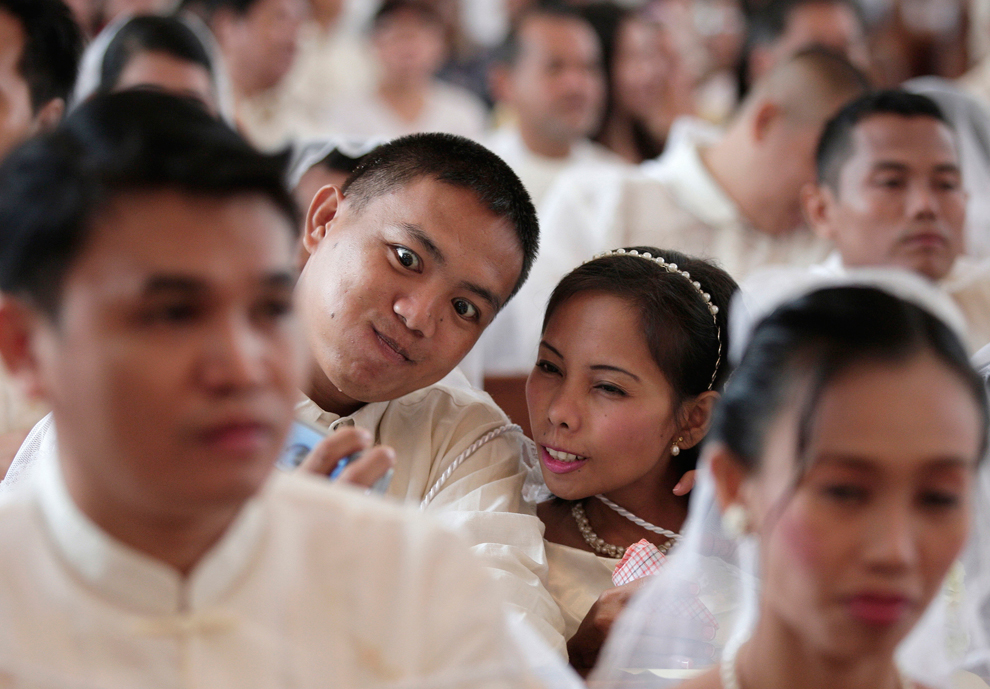 మనీలా, ఫిలిప్పైన్స్: సామూహిక పెళ్లిలో సెల్ ఫోన్ కి ఫోజు ఇస్తున్న ఓ కొత్త జంట