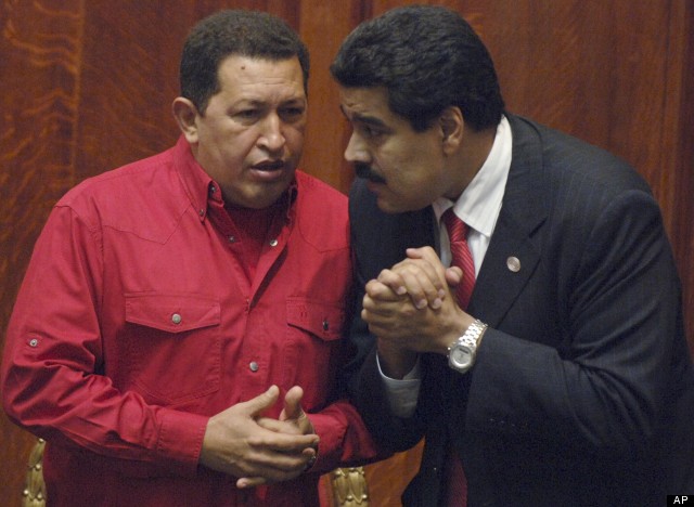 FILE – In this Dec. 18, 2007 file photo Venezuela’s President Hugo Chavez, left, talks to his Foreign Minister Nicolas Maduro at the University of Uruguay in Montevideo, Uruguay. President Hugo Chavez on Wednesday, Oct. 10, 2012, named Nicolas Maduro as his new vice president. Maduro, a former National Assembly member, has headed the foreign ministry since 2006, and is seen as one of the administration’s hard-liners. (AP Photo/Matilde Campodonico, File)
