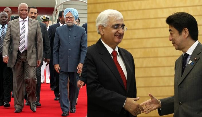 దర్బన్ (దక్షిణాఫ్రికా)లో న్యాయమంత్రి జెఫ్రీ తమ్సంగతో ప్రధాని మన్మోహన్ (ఎడమ); జపాన్ ప్రధాని షింజో అబె తో భారత విదేశీ మంత్రి సల్మాన్ ఖుర్షీద్