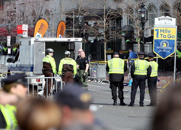 BOSTON, MA – APRIL 15: Boston Police guard an area at the one mile checkpoint near Kenmore Square after two bombs exploded during the 117th Boston Marathon on April 15, 2013 in Boston, Massachusetts. Two people are confirmed dead and at least 23 injured after two explosions went off near the finish line to the marathon. Alex Trautwig/Getty Images/AFP