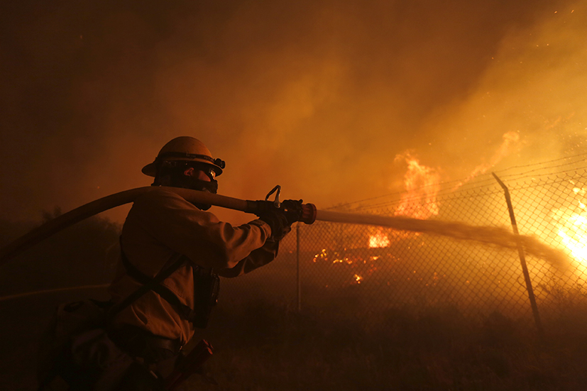 A firefighter battles to protect a CalTrans Maintenance Station and Fuel Depot from the Springs Fire near Pacific Coast Highway and the Los Angeles County Line at Malibu, California, May 2, 2013. A wind-driven wildfire raging along the California coast north of Los Angeles prompted the evacuation of hundreds of homes and a university campus on Thursday as flames engulfed several farm buildings and recreational vehicles near threatened neighborhoods. REUTERS/Patrick T. Fallon (UNITED STATES – Tags: DISASTER ENVIRONMENT) – RTXZ8FZ